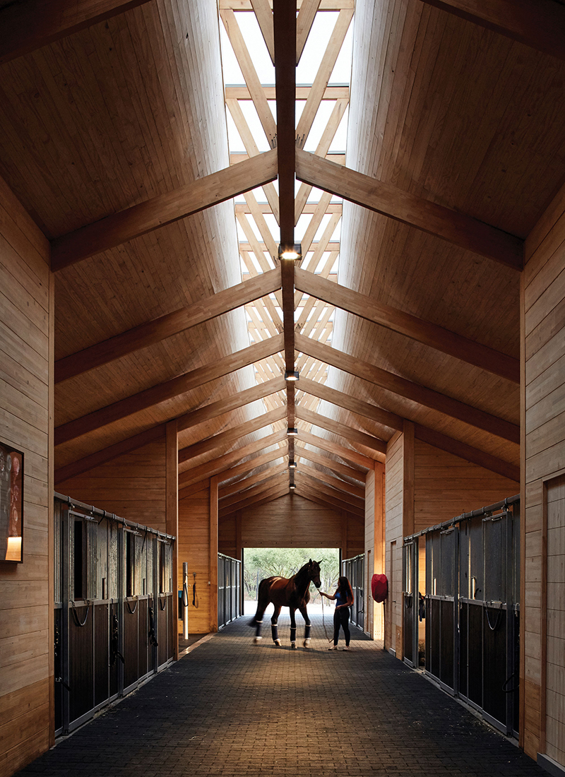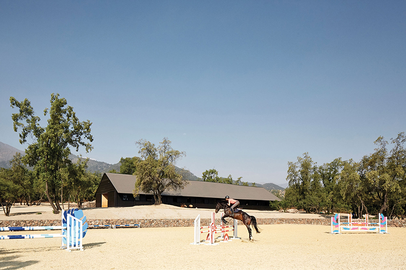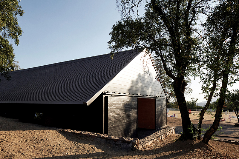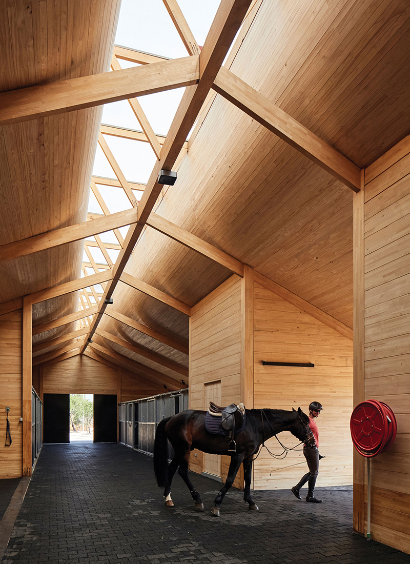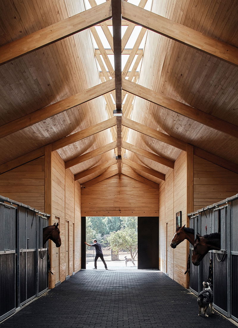 This barn is part of a group of constructions scattered in a 3ha site on the foothills of the cordillera de Los Andes near Santiago. Conceived to house 14 showjumping horses, the simple gable roof structure is designed to allow enough natural light in to work indoors through out the year with minimum artificial light required.
